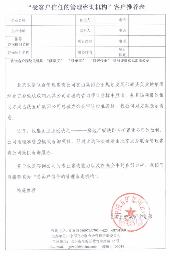 北京求是聯(lián)合管理咨詢公司在由集團(tuán)企業(yè)規(guī)劃發(fā)展部牽頭負(fù)責(zé)的集團(tuán)結(jié)合貿(mào)易板塊改制及其公司治理的咨詢項目況標(biāo)中勝出,并助該項目的相關(guān)方案已獲五礦集團(tuán)公司總裁辦公會審議批準(zhǔn)通過,我公司對方案表示滿意。