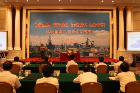 為解放思想,應(yīng)對危機(jī),深化改革,提升管理,武鋼集團(tuán)在湖北咸寧碧桂園鳳凰溫泉酒店,隆重開辦了為期三天的武鋼領(lǐng)導(dǎo)人員學(xué)習(xí)研討班。學(xué)習(xí)班還邀請了軍事經(jīng)濟(jì)學(xué)院院長周來信少將、神化集團(tuán)董事長張喜武、亞琛工業(yè)大學(xué)冶金系主任Bleck教授、中國鋼鐵協(xié)會(huì)名譽(yù)會(huì)長吳溪淳、GE公司中國區(qū)總裁Mark、海爾集團(tuán)董事會(huì)主席張瑞敏作精彩的專題講座。