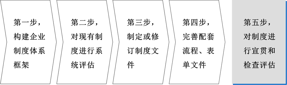 企業(yè)制度體系,是員工在企業(yè)日常生產(chǎn)經(jīng)營過程中共同遵守的規(guī)定和準則,是企業(yè)賴以生存和發(fā)展的基礎(chǔ),是企業(yè)正常運營的保障機制。一家小公司,在制度不健全的情況下,依靠管理者的經(jīng)驗和能力或許可以維持公司正常運營,當(dāng)企業(yè)發(fā)展到一定規(guī)模,再單純依靠“人治”顯然是不夠的;大公司擁有較為復(fù)雜的組織架構(gòu)和更多的員工,更需要依靠“法治”即規(guī)范的制度體系來保障公司的良好運營。成功的企業(yè)離不開健全的制度體系以及制度的有效執(zhí)行。建立健全企業(yè)制度體系,可以采取以下五個步驟有序推進。