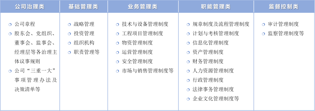 除以上類別制度,國有企業(yè)還需要重點從兩個方面強化制度體系建設(shè):一方面,需要依據(jù)財政部等五部委聯(lián)合發(fā)布的《企業(yè)內(nèi)部控制配套指引》等內(nèi)控政策,滿足國企制度體系建設(shè)合規(guī)性方面的要求;另一方面,需要強化黨建管理類制度體系建設(shè),具體包括黨組織管理、紀檢管理、工會管理、團委管理等子類別制度。
