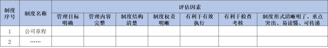 現(xiàn)有制度可以從以下幾個維度著手進行系統(tǒng)評估:管理目標是否明確?管理內(nèi)容是否完整?制度結(jié)構(gòu)是否清楚?制度權(quán)責(zé)是否明晰?是否有利于有效執(zhí)行?是否有利于檢查考核?制度形式是否清晰明了、重點突出、易讀懂、可傳遞?