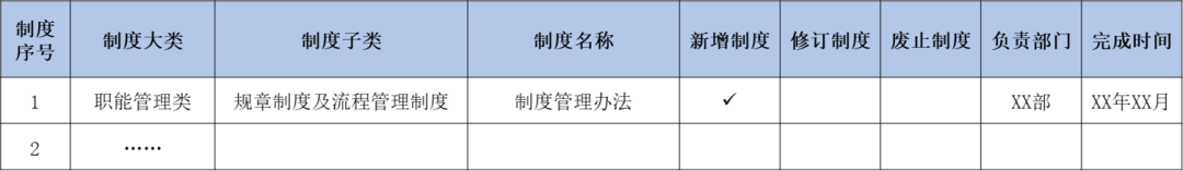 基于新構(gòu)建的制度體系框架與現(xiàn)有制度對照分析情況,以及現(xiàn)有制度評估情況,制定清晰的企業(yè)制度體系建設(shè)計劃,明確需要新增、修訂、廢止的制度有哪些,以及具體的責(zé)任部門與時間計劃安排。