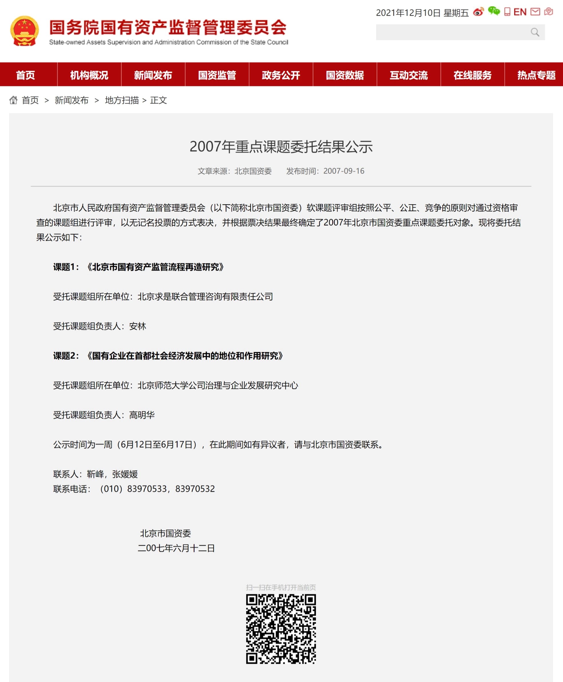2007年6月,求是咨詢中標(biāo)北京市國(guó)資委重點(diǎn)課題《北京市國(guó)有資產(chǎn)監(jiān)管流程再造研究》。課題由時(shí)任北京市委常委、常務(wù)副市長(zhǎng)吉林牽頭負(fù)責(zé)。