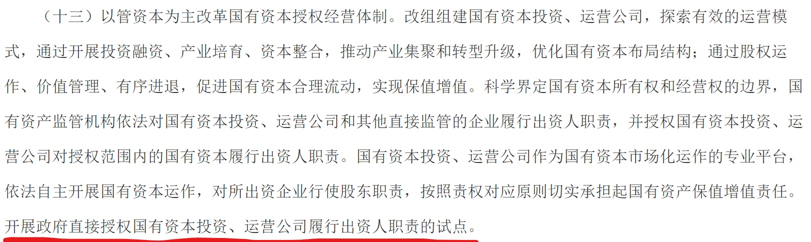 2015年中共中央、國(guó)務(wù)院《關(guān)于深化國(guó)有企業(yè)改革的指導(dǎo)意見(jiàn)》正式提出要“開(kāi)展政府直接授權(quán)國(guó)有資本投資、運(yùn)營(yíng)公司履行出資人職責(zé)的試點(diǎn)工作”。