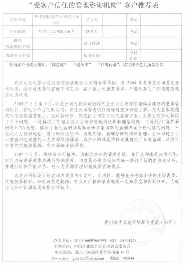 求是公司所設計的咨詢方案具有針對性,實用性,能夠充分考慮企業(yè)的實際需要,實施效果較好,公司滿意度較高,在我貴州省煙草系統(tǒng)有一定知名度和良好口碑,已成為我公司管理咨詢長期合作伙伴。
