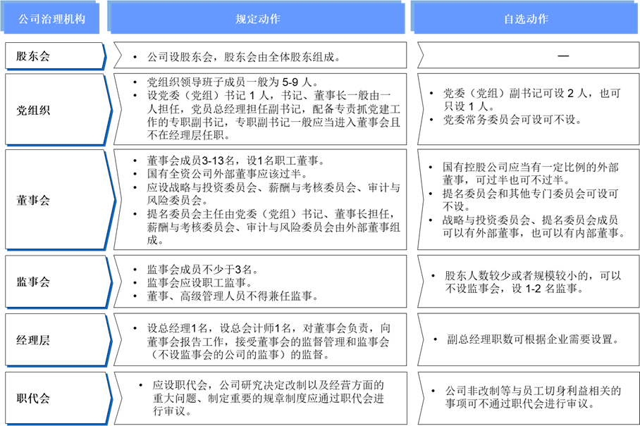 以中央企業(yè)(國有全資/控股公司)為例,《公司法》、《關于進一步完善國有企業(yè)法人治理結構的指導意見》、《中央企業(yè)公司章程指引(試行)(國有全資/國有控股公司)》等文件對公司治理機構及人員配置提出了一些具體要求,包括“四會一層”人員數(shù)量、人員構成,以及董事會下設專門委員會數(shù)量以及人員構成等,在這些“規(guī)定動作”之外,企業(yè)可以結合實際需要決定是否設黨委常委會、董事會提名委員會、監(jiān)事會等機構,以及經(jīng)理層成員數(shù)量等。