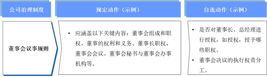 以中央企業(yè)(國有全資/控股公司)《董事會議事規(guī)則》為例,在公司《章程》中已經(jīng)明確了董事會組成和職權、董事的權利和義務、董事長職權、董事會會議召開要求、董事會秘書與辦事機構,這些作為“規(guī)定動作”必須在《董事會議事規(guī)則》中體現(xiàn),且相關內容不得與公司《章程》相悖。此外,公司可以結合公司實際情況,增加董事會對董事長、總經(jīng)理授權的職權;結合董事會運作需要增加所需支持與服務等內容。