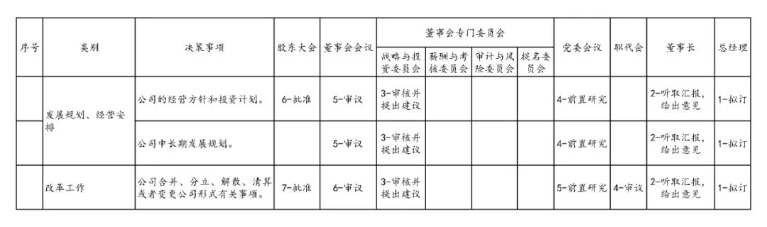 以中央企業(yè)(國有全資/控股公司)為例,公司治理相關法律、法規(guī)、政策文件中對各公司治理主體的職權已有許多明確的要求,這些是“規(guī)定動作”,應在相關公司治理制度中體現(xiàn)。此外,企業(yè)可結合所處行業(yè)及企業(yè)不同發(fā)展階段的特點,細化“三重一大”決策事項,并根據(jù)股東授權放權情況,明確相關事項的決策主體,明晰權責邊界。