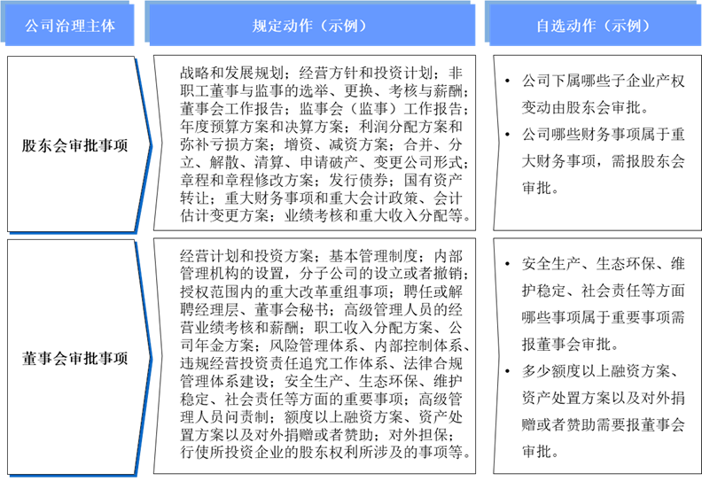 以中央企業(yè)(國有全資/控股公司)為例,《公司法》、《中央企業(yè)公司章程指引(試行)(國有全資/國有控股公司)》對公司《章程》的內容,以及各公司治理主體的職權、會議召開、決策方式等提出了具體要求,這些屬于“規(guī)定動作”;在這些具體要求之外,企業(yè)結合實際情況對各公司治理主體職權等進行細化或補充完善,則屬于“自選動作”。