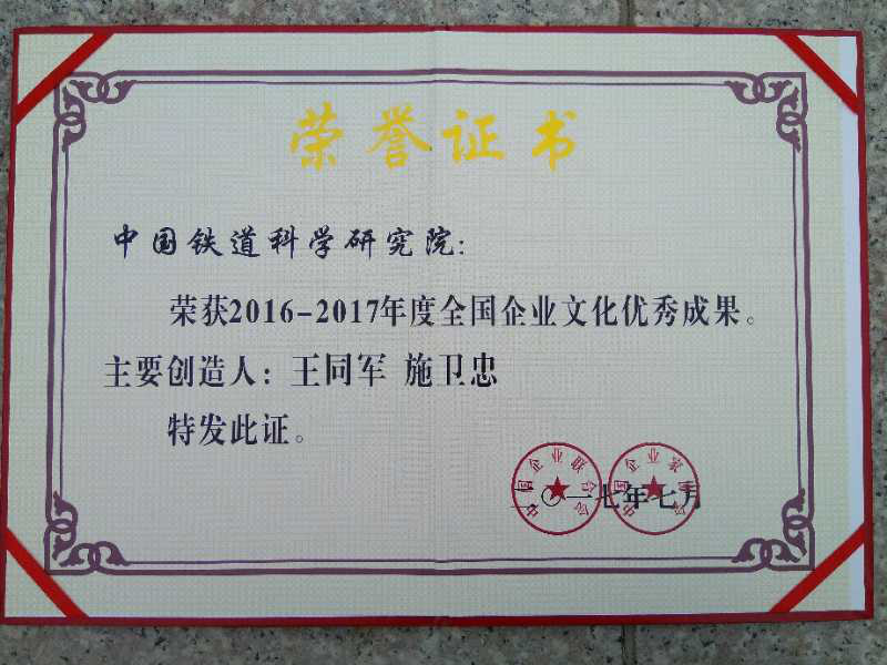 近年來,鐵科院企業(yè)文化開始深入人心。企業(yè)文化建設(shè)成果獲得中國鐵路總公司原總經(jīng)理盛光祖、現(xiàn)任總經(jīng)理陸東福、現(xiàn)任副總經(jīng)理(當時鐵科院院長)王同軍的充分肯定和高度評價。同時,榮獲全國、鐵路行業(yè)兩級“企業(yè)文化優(yōu)秀成果”獎項。