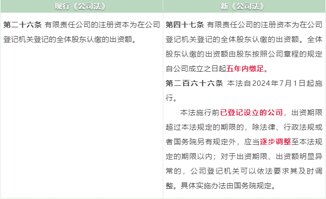 對(duì)于已經(jīng)設(shè)立的公司,新《公司法》設(shè)置了“過(guò)渡期”規(guī)則,第266條規(guī)定:本法施行前已登記設(shè)立的公司,出資期限超過(guò)本法規(guī)定的期限的,除法律、行政法規(guī)或者國(guó)務(wù)院另有規(guī)定外,應(yīng)當(dāng)逐步調(diào)整至本法規(guī)定的期限以內(nèi);對(duì)于出資期限、出資額明顯異常的,公司登記機(jī)關(guān)可以依法要求其及時(shí)調(diào)整。