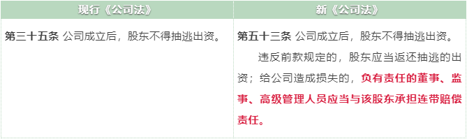新《公司法》第53條規(guī)定:公司成立后,股東不得抽逃出資。違反前款規(guī)定的,股東應(yīng)當(dāng)返還抽逃的出資;給公司造成損失的,負(fù)有責(zé)任的董事、監(jiān)事、高級(jí)管理人員應(yīng)當(dāng)與該股東承擔(dān)連帶賠償責(zé)任。
