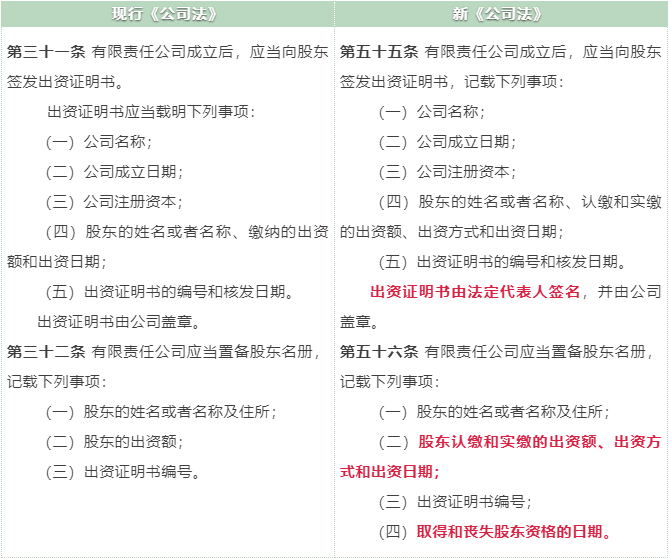 新《公司法》第55條在現(xiàn)行《公司法》第31條,僅要求出資證明書由公司蓋章的基礎(chǔ)上要求法定代表人簽名。