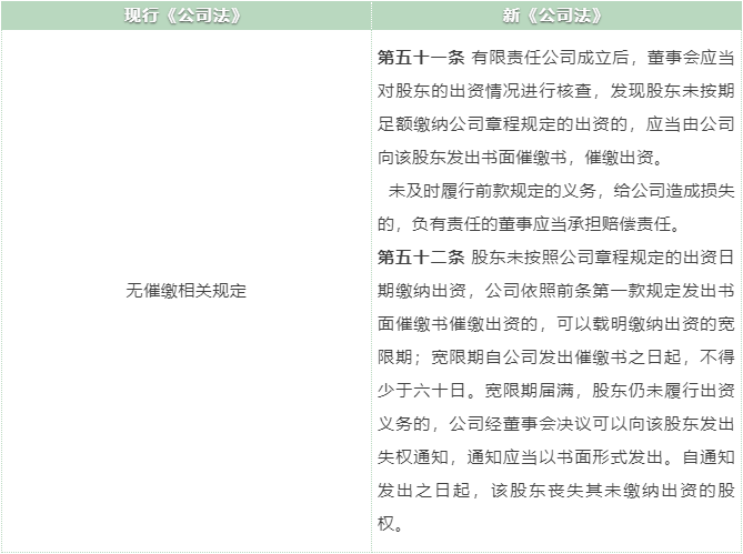 新《公司法》第 51 條提出董事會(huì)對(duì)股東出資催繳負(fù)有責(zé)任與義務(wù);第 52條提出股東未按照公司章程規(guī)定的出資日期繳納出資,寬限期滿可發(fā)失權(quán)通知,股東將因此喪失其未繳納出資的股權(quán)。