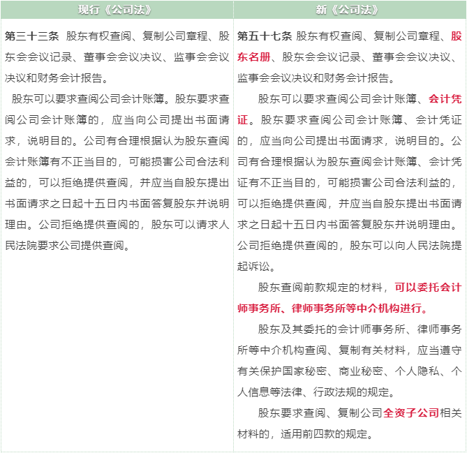新《公司法》第 57 條新增了股東有權(quán)查閱和復(fù)制公司的股東名冊(cè),有權(quán)查閱公司會(huì)計(jì)憑證的規(guī)定;明確股東可以委托會(huì)計(jì)師事務(wù)所、律師事務(wù)所等中介機(jī)構(gòu)行使知情權(quán)的規(guī)定;同時(shí)新增了股東對(duì)全資子公司相關(guān)資料的查閱、復(fù)制權(quán)。