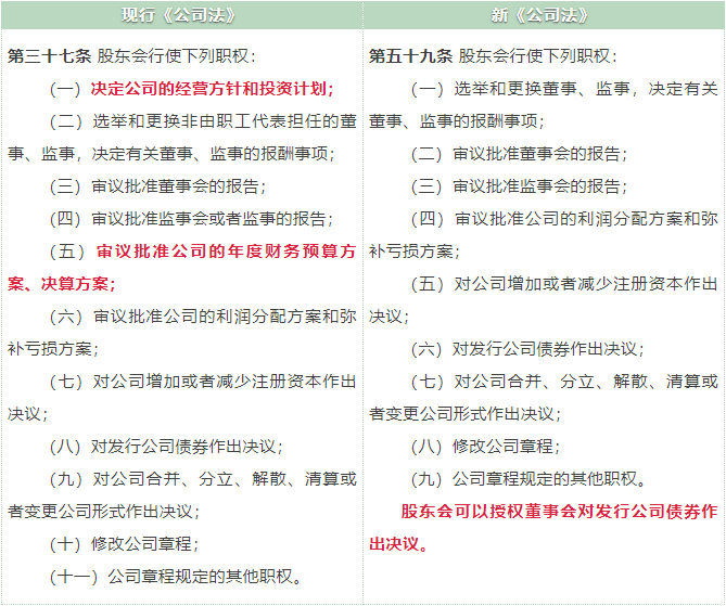 新《公司法》第 59 條刪除了現(xiàn)行《公司法》中股東會(huì)“決定公司的經(jīng)營(yíng)方針和投資計(jì)劃” “審議批準(zhǔn)公司的年度財(cái)務(wù)預(yù)算方案、決算方案”兩項(xiàng)職權(quán);增加了“股東會(huì)可以授權(quán)董事會(huì)對(duì)發(fā)行債券作出決議”這項(xiàng)職權(quán)。股東會(huì)的職權(quán)進(jìn)一步精簡(jiǎn),也意味將給予董事會(huì)更大授權(quán)放權(quán)。