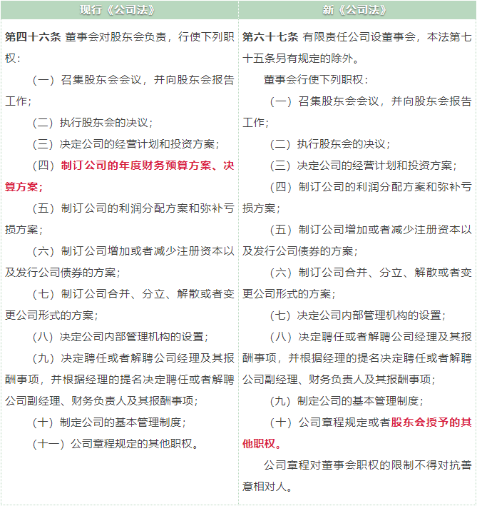 新《公司法》第 67 條刪除了董事會(huì)"制訂公司的年度財(cái)務(wù)預(yù)算方案、決算方案”的職權(quán),增加了“股東會(huì)可以授予董事會(huì)其他職權(quán)”;明確公司章程對(duì)董事會(huì)的權(quán)力限制不得對(duì)抗善意相對(duì)人。