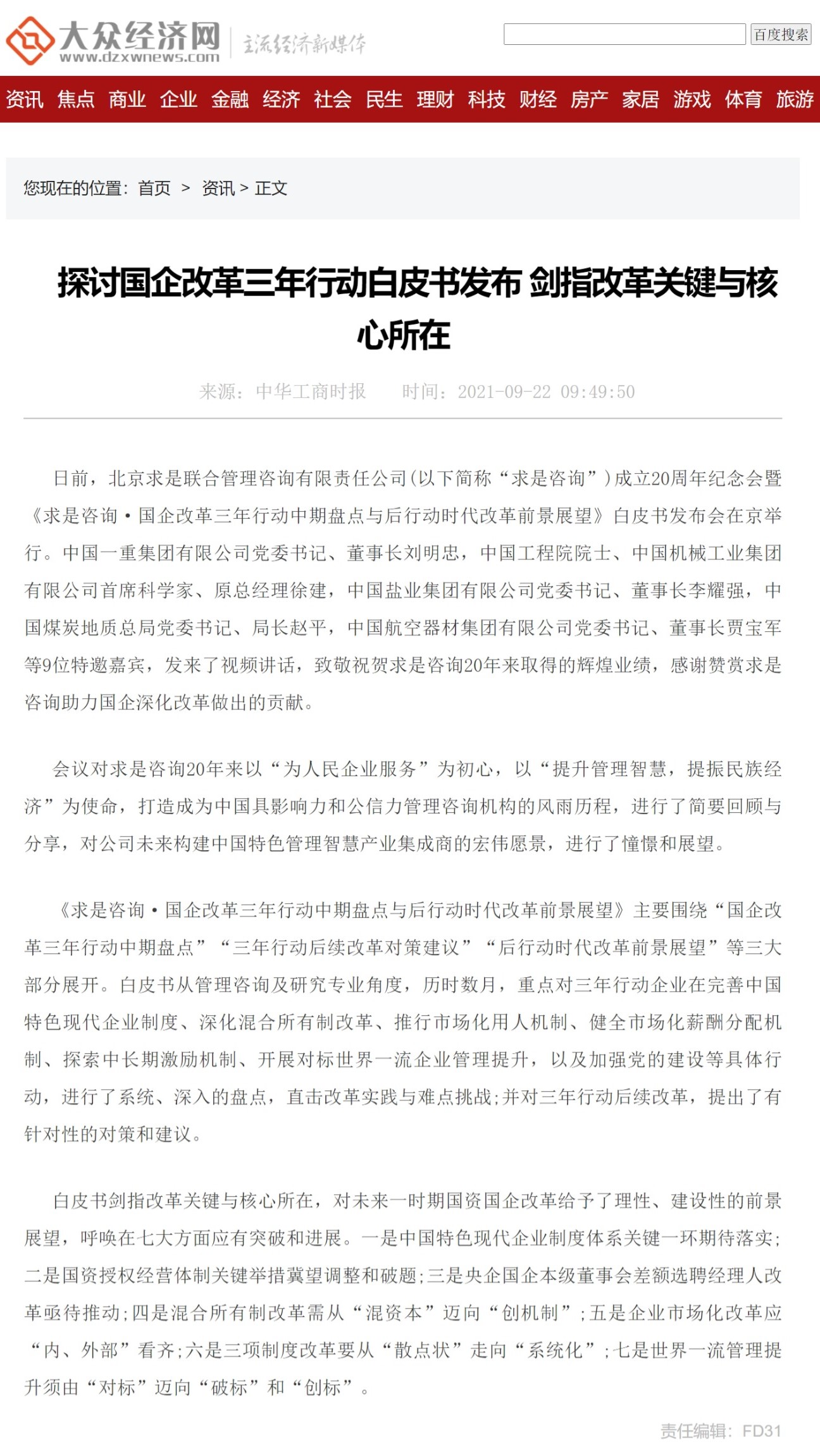 《大眾經(jīng)濟網(wǎng)》:探討國企改革三年行動白皮書發(fā)布 劍指改革關(guān)鍵與核心所在