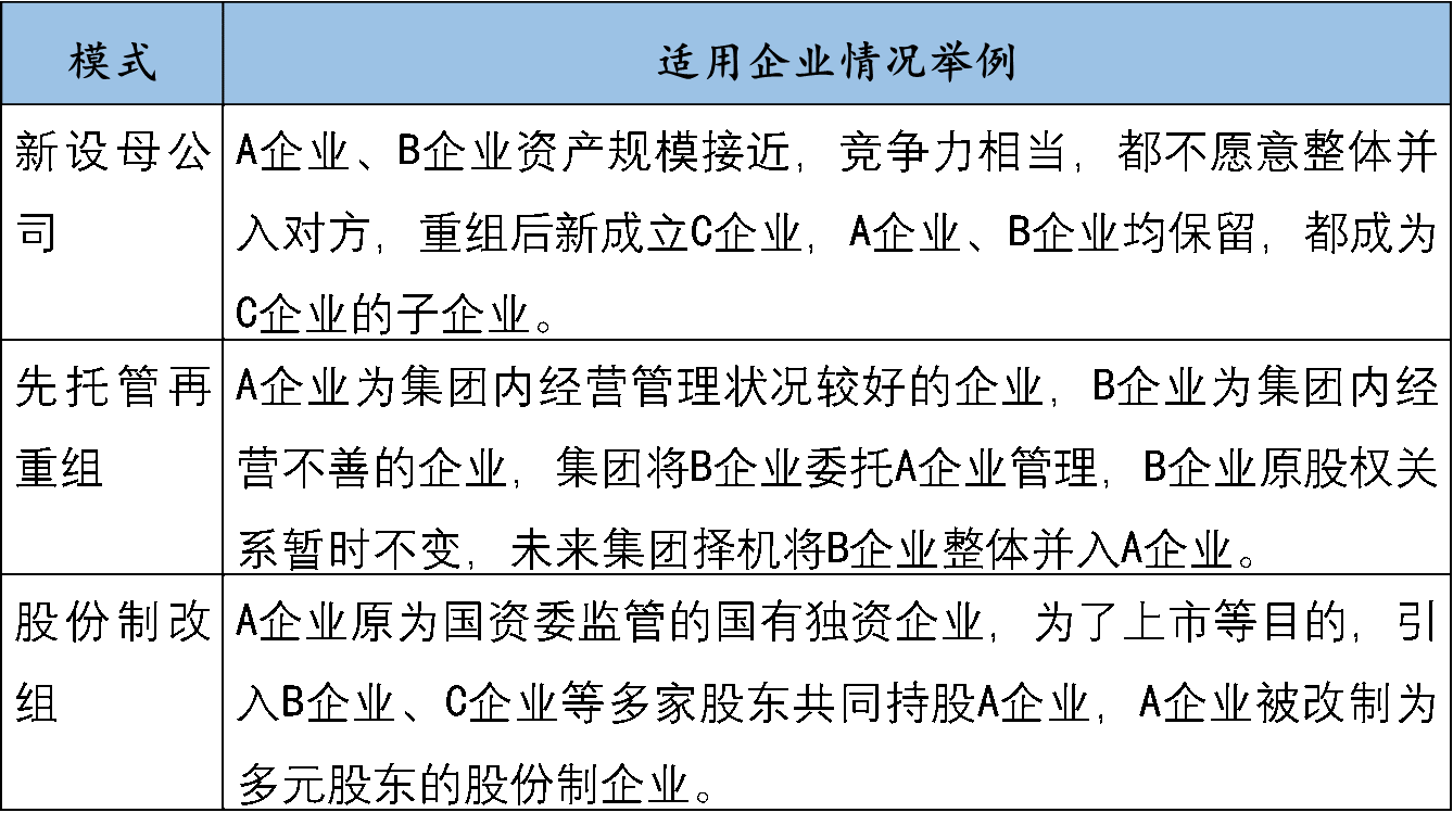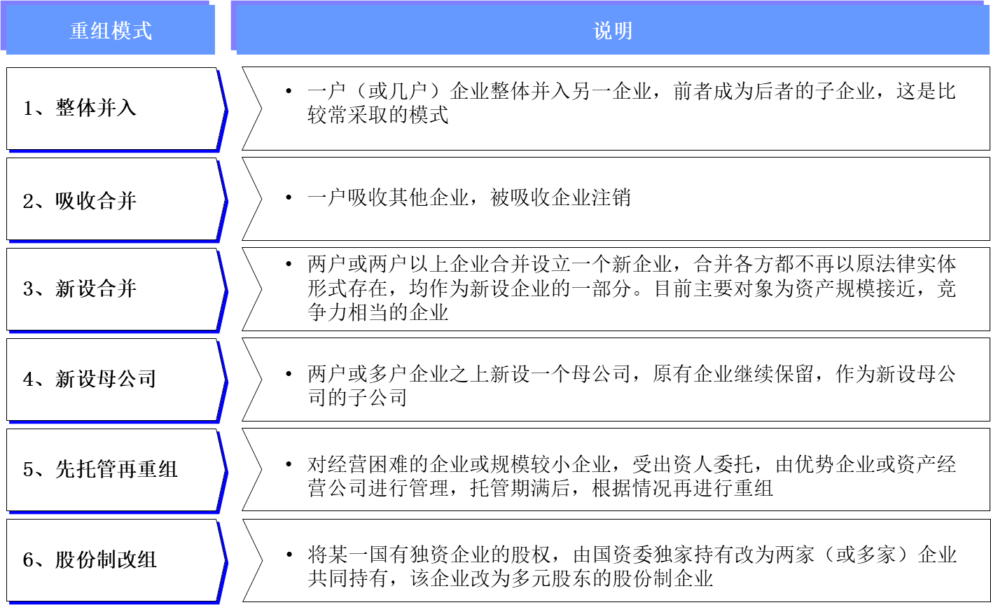 以中央企業(yè)為例,重組主要有六種模式:整體并入、吸收合并、新設合并、新設母公司、先托管再重組、股份制改組。