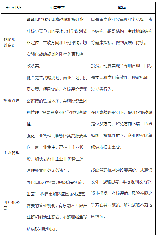 《通知》中將戰(zhàn)略管理問題主要界定為戰(zhàn)略管理意識不強、投資決策不科學、主責主業(yè)不突出、國際化經(jīng)營水平不高,提出了戰(zhàn)略規(guī)劃意識、投資管理、主業(yè)主責管理、國際化經(jīng)營等四項標桿任務。