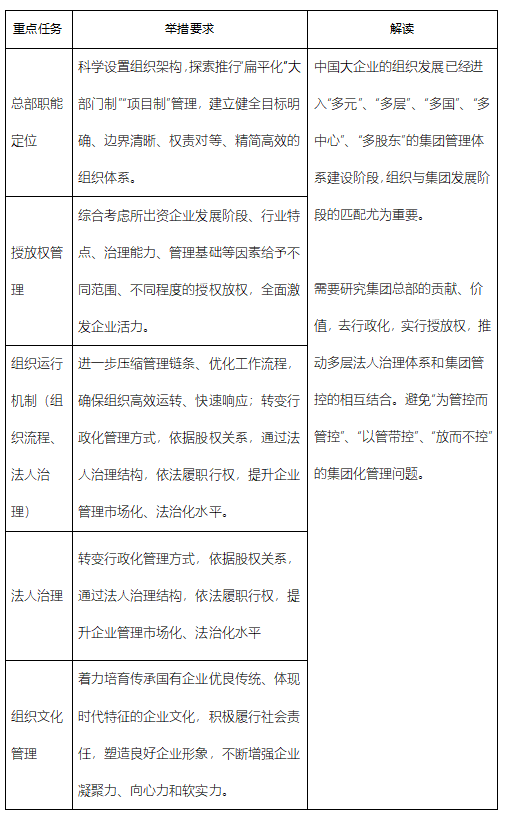 《通知》中將組織管理問題主要界定為總部定位不清晰、機構設置不匹配、授權放權不充分、流程運轉不順暢、管理方式不合理,提出了總部職能定位、授放權管理、組織運行機制、法人治理、組織文化管理等五項對標任務。