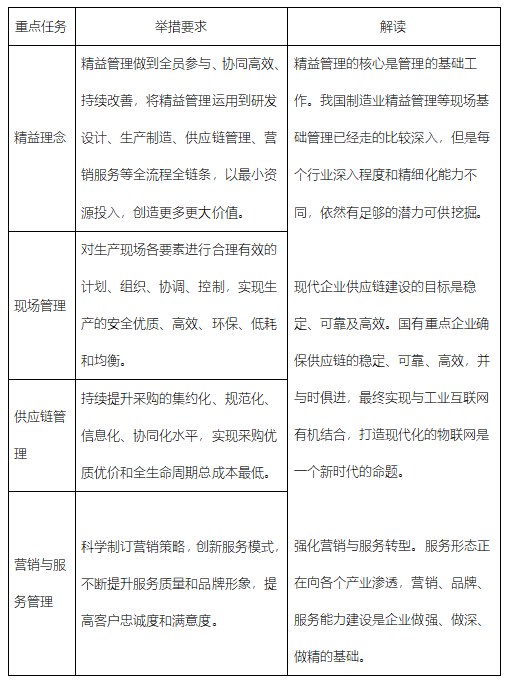 《通知》中將運營管理問題主要界定為精細化管理能力不強、成本和質量管控不到位、運營效率不高,,提出了精益理念、現(xiàn)場管理、供應鏈管理、營銷與服務管理等四項對標任務。