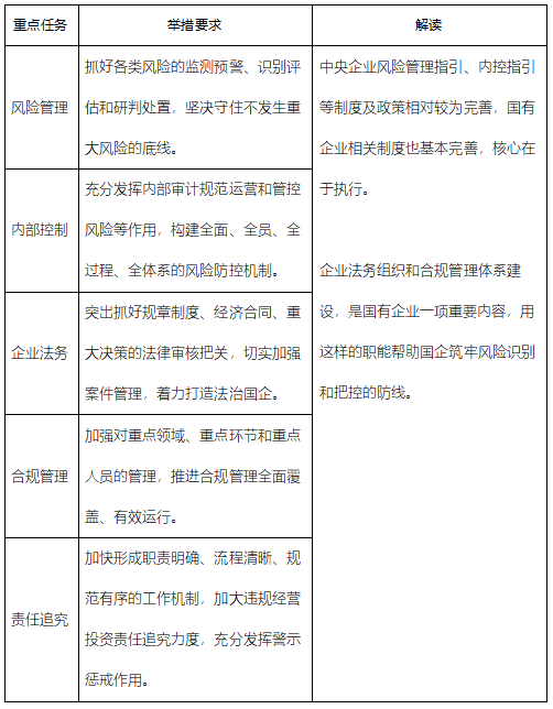 《通知》中將風險管理問題主要界定為強化風險防控意識、加強內(nèi)控體系建設、推進法律管理與經(jīng)營管理深度融合、健全合規(guī)管理制度、加強責任追究體系建設,提出了風險管理、內(nèi)部管控、企業(yè)法務、合規(guī)管理、責任追究等四項對標任務。