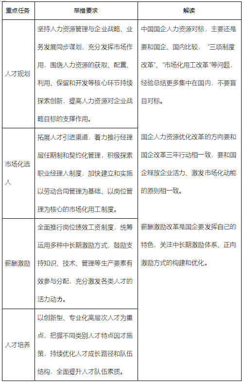 《通知》中將人力資源管理主要問題界定為人力資源規(guī)劃不清晰、三項制度改革落實不到位、人才隊伍活力不足、高層次領軍人才缺乏,提出了人才規(guī)則、市場化選人、薪酬激勵、人才培養(yǎng)等四項對標任務。