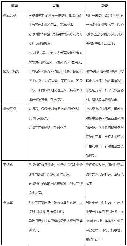 對標過程中可能存在的問題是比較多的,總結求是咨詢既往的經(jīng)驗,筆者提出如下幾個可能的問題,如模式機械、策略不系統(tǒng)、機制短視、不落地、少標準,希望各企業(yè)能夠從中有所學習借鑒,做好對標,跨越對標,成功實現(xiàn)世界一流管理。