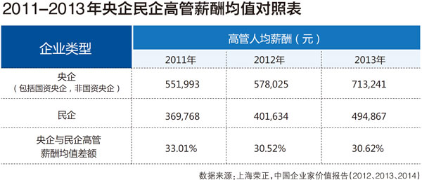 上海榮正投資咨詢有限公司連續(xù)15年發(fā)布《中國(guó)企業(yè)家價(jià)值報(bào)告》,統(tǒng)計(jì)樣本為A股上市公司的年度財(cái)務(wù)報(bào)告。上表為2011-2013年央企高管薪酬均值。
