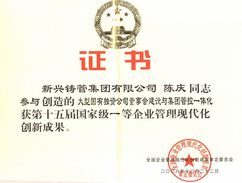 3月28日,2009年中國(guó)企業(yè)管理創(chuàng)新大會(huì)發(fā)布第十五屆國(guó)家級(jí)企業(yè)管理現(xiàn)代化創(chuàng)新成果獲獎(jiǎng)名單。我公司長(zhǎng)期客戶——中央企業(yè)新興鑄管集團(tuán)之《大型國(guó)有獨(dú)資公司董事會(huì)建設(shè)和集團(tuán)管控一體化》榮獲國(guó)家級(jí)管理創(chuàng)新成果一等獎(jiǎng)。