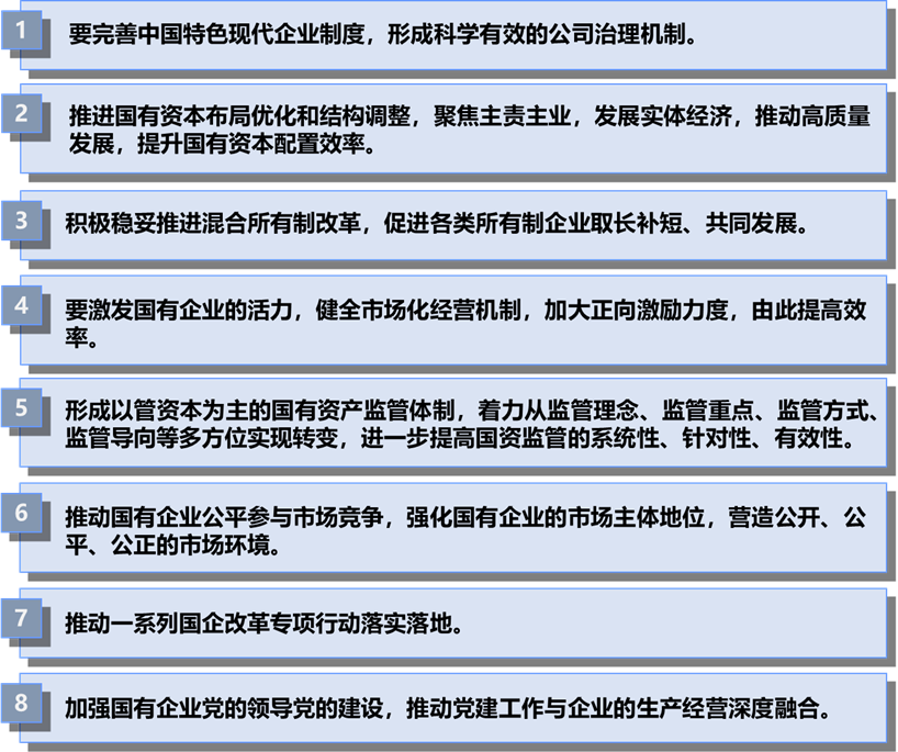 要評價國企改革三年行動成效如何,首先要回顧最初制定了哪些重點任務。2020年6月底,中央全面深化改革委員會第十四次會議審議通過了《國企改革三年行動方案(2020-2022年)》,明確此后3年是國企改革關鍵階段。從行動方案來看,國企改革三年行動是落實改革頂層設計的具體“施工圖”,聚焦八個方面重點任務。