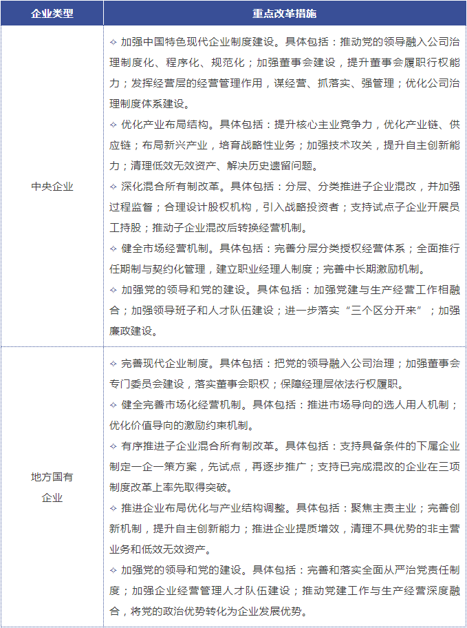 從求是咨詢團隊近期服務的多家具有較強代表性的國企改革三年行動方案中重點改革舉措來看,中國特色現(xiàn)代企業(yè)制度建設、國有經濟布局優(yōu)化和結構調整、積極穩(wěn)妥推進混合所有制改革、健全市場化經營機制、加強黨的領導黨的建設這五項重點任務是改革的重中之重,也被其他眾多國企列入改革三年行動計劃。