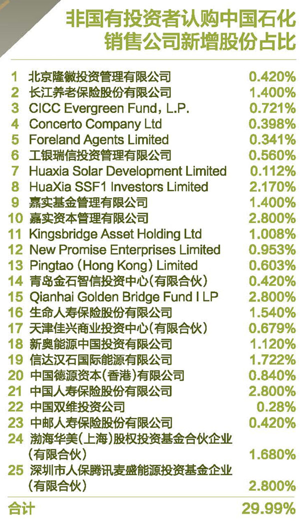 9月14日,中國(guó)石化發(fā)布公告稱(chēng),其全資子公司中國(guó)石化銷(xiāo)售有限公司已與25家境內(nèi)外投資者簽署增資協(xié)議。25家投資者以現(xiàn)金1070.94億元認(rèn)購(gòu)增資后銷(xiāo)售公司29.99%的股權(quán)。其中,占股最大的四家分別為中國(guó)人壽、深圳人保騰訊麥?zhǔn)⒛茉赐顿Y基金(有限合伙)、QianhaiGoldenBridgeFundILP、嘉實(shí)資本,各占2.8%的股權(quán)。
