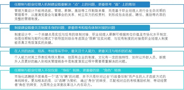那么對于國資委推進(jìn)國有企業(yè)改革的重大舉措,其中就包含經(jīng)理層成員任期制和契約化管理及職業(yè)經(jīng)理人制度建設(shè)。一方面,經(jīng)理層成員任期制和契約化管理及職業(yè)經(jīng)理人制度建設(shè)是建立有效國有企業(yè)公司治理機(jī)制的重要途徑。另一方面,在現(xiàn)代國有企業(yè)制度中,“三會一層”等公司議事管理規(guī)則的有效實施,也離不開經(jīng)理層成員任期制和契約化管理及經(jīng)理人制度建設(shè)。