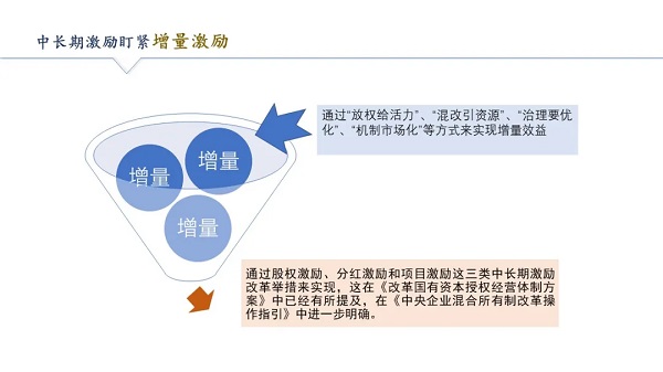 此次國企改革中的強化激勵的著眼點是增量效益激勵,這與基于存量效益的工資總額管理制度迥然不同。增量效益激勵又分兩部分:一是如何實現(xiàn)增量效益,主要通過“放權(quán)給活力”、“混改引資源”、“治理要優(yōu)化”、“機(jī)制市場化”等方式來實現(xiàn)增量效益;二是如何對增量效益進(jìn)行分配,主要是通過股權(quán)激勵、分紅激勵和項目激勵這三類中長期激勵改革舉措來實現(xiàn),這在《改革國有資本授權(quán)經(jīng)營體制方案》中已經(jīng)有所提及,在《中央企業(yè)混合所有制改革操作指引》中進(jìn)一步明確。
