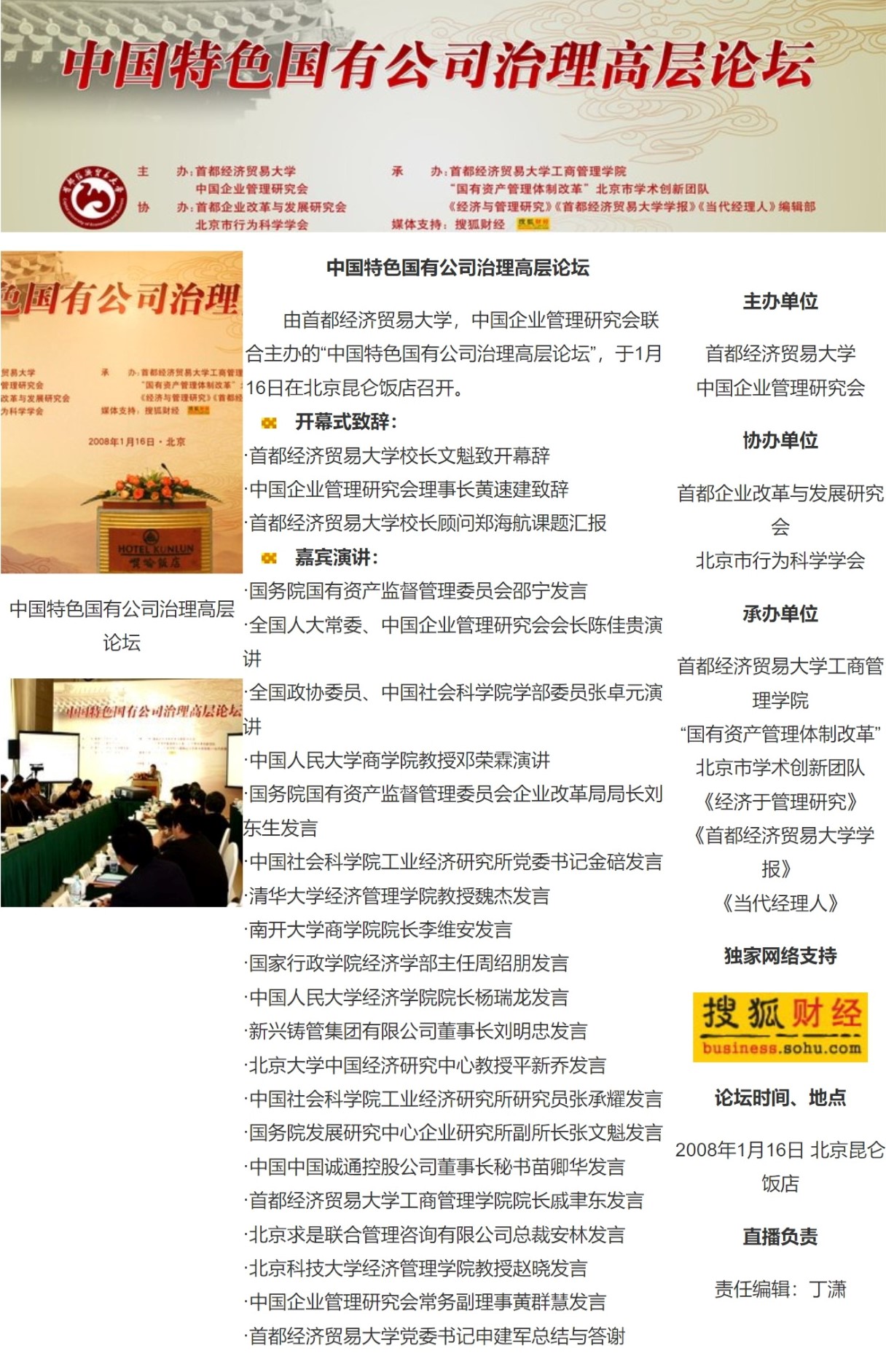 2008年1月16日,由首都經(jīng)濟(jì)貿(mào)易大學(xué)、中國(guó)企業(yè)管理研究會(huì)共同主辦的《中國(guó)國(guó)有企業(yè)公司治理高層論壇》在北京昆侖飯店舉行。求是咨詢(xún)董事長(zhǎng)、管理學(xué)博士安林(二排左三)應(yīng)邀出席并發(fā)表演講:“中國(guó)特色國(guó)有公司治理八大展望”。