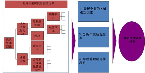 績(jī)效考核指標(biāo)體系要建立在集團(tuán)戰(zhàn)略目標(biāo)要求的基礎(chǔ)之上。借助價(jià)值樹(shù),找出驅(qū)動(dòng)集團(tuán)整體經(jīng)營(yíng)良性發(fā)展的因素,并通過(guò)分析集團(tuán)關(guān)鍵成功因素,總結(jié)年度經(jīng)營(yíng)重點(diǎn),列出管理層可控項(xiàng)目,最終確定出集團(tuán)組織績(jī)效的關(guān)鍵業(yè)績(jī)指標(biāo)。如圖所示: