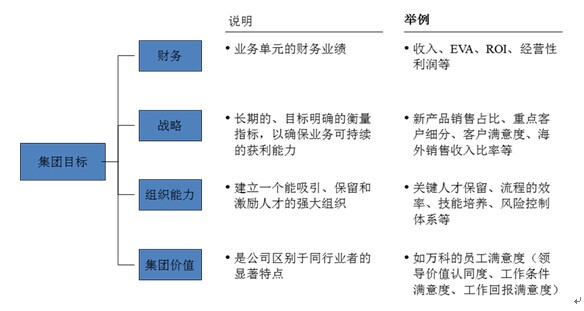 集團(tuán)公司對(duì)各組織的管控模式不同,會(huì)導(dǎo)致組織績(jī)效指標(biāo)體系中各類型指標(biāo)的權(quán)重有所差異。越分權(quán)的單位,財(cái)務(wù)指標(biāo)權(quán)重要高一些,越集權(quán)的單位,財(cái)務(wù)指標(biāo)權(quán)重要低一些,反之亦然。同時(shí),集團(tuán)公司不能只關(guān)注短期的財(cái)務(wù)利益,為了企業(yè)可持續(xù)發(fā)展,應(yīng)該平衡財(cái)務(wù)與非財(cái)務(wù)指標(biāo)的權(quán)重,選擇行之有效的非財(cái)務(wù)指標(biāo)。非財(cái)務(wù)指標(biāo)的定義不準(zhǔn)確,往往會(huì)造成平衡性的業(yè)績(jī)指標(biāo)框架流于形式,不能牽引短期財(cái)務(wù)利益達(dá)成和長(zhǎng)期核心能力的平衡發(fā)展。下圖簡(jiǎn)單列出從財(cái)務(wù)、戰(zhàn)略、組織能力、集團(tuán)價(jià)值四方面提煉的財(cái)務(wù)與非財(cái)務(wù)指標(biāo)。
