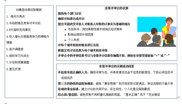 組織績(jī)效管理過(guò)程中,集團(tuán)公司要建立業(yè)績(jī)述職機(jī)制,定期進(jìn)行業(yè)績(jī)?cè)u(píng)審會(huì)。評(píng)審會(huì)要有明確的議題,包括與各組織就指標(biāo)標(biāo)準(zhǔn)達(dá)成共識(shí),對(duì)被考核者的情況進(jìn)行總結(jié),為各組織進(jìn)行評(píng)級(jí)等內(nèi)容。具體如下圖所示。