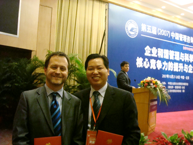 2007年10月公司總裁安林博士在第五屆中國管理咨詢高峰會上與畢博大中華區(qū)主席兼CEO榮瑪贊分別代表中、外公司榮獲“優(yōu)秀機構(gòu)代表”和“值得客戶信任的管理咨詢機構(gòu)”獎項。