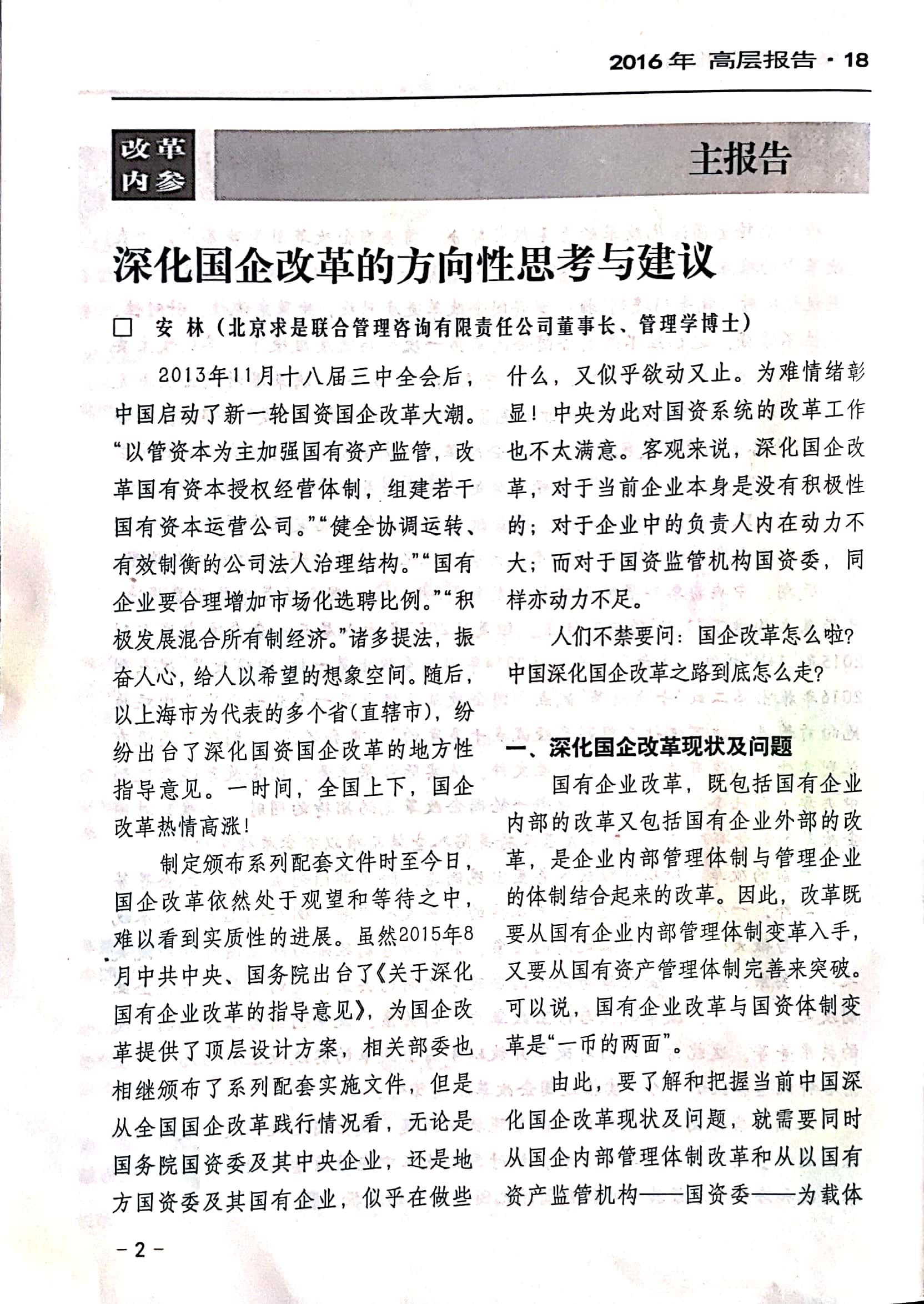 2016年8月,求是咨詢董事長(zhǎng)、《改革內(nèi)參》高層報(bào)告特約研究員安林博士,為《改革內(nèi)參》高層報(bào)告撰寫特約報(bào)告《深化國(guó)企改革的方向性思考與建議》。