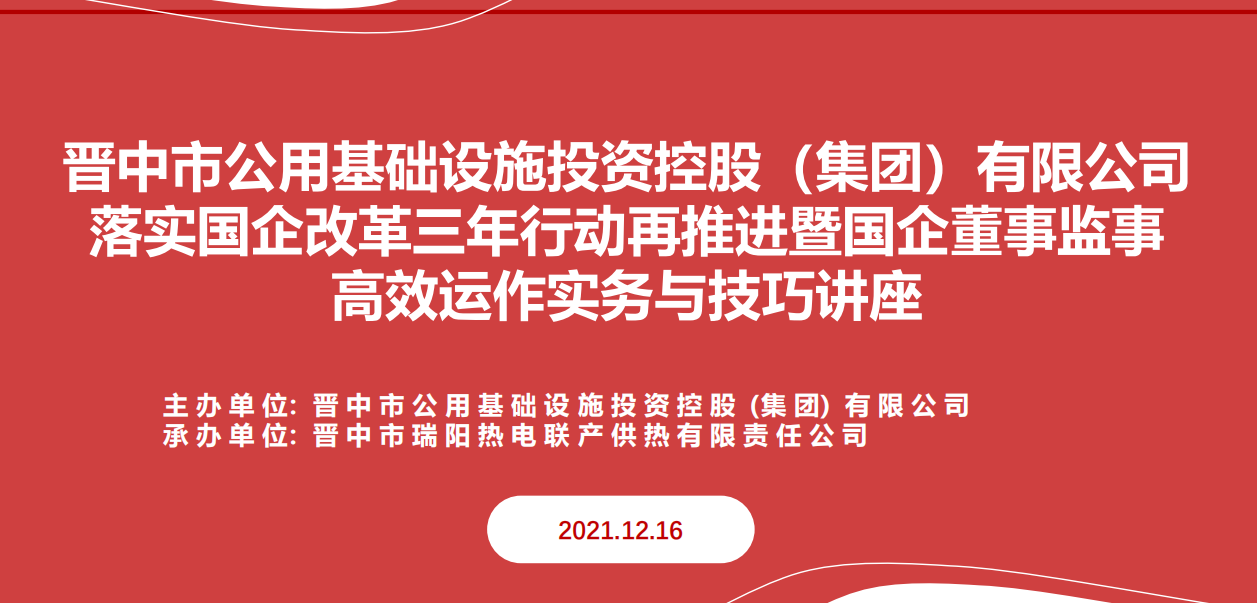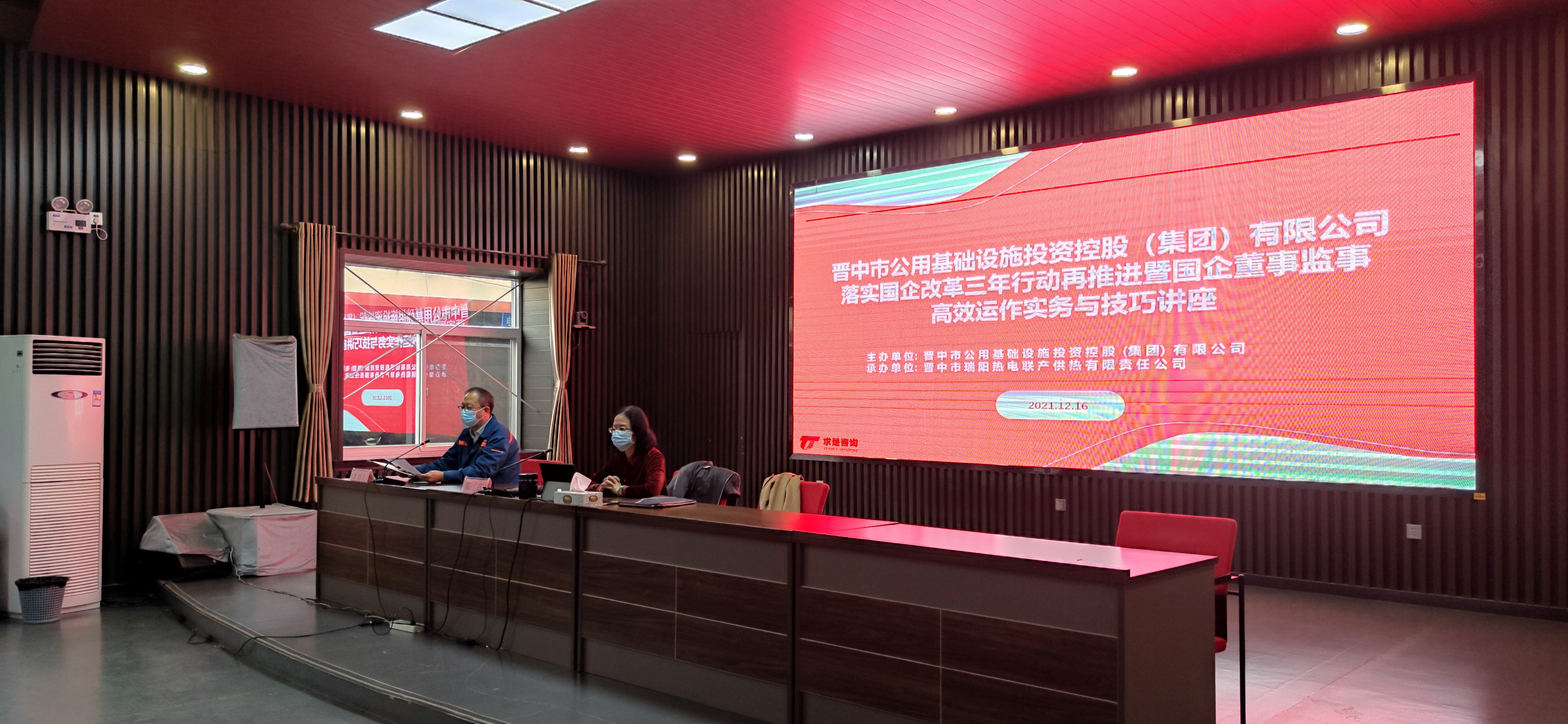 2021年12月16日,求是咨詢總經(jīng)理陳慶博士應(yīng)山西省晉中市公用基礎(chǔ)設(shè)施投資控股(集團(tuán))有限公司(以下簡(jiǎn)稱公投集團(tuán))、晉中市瑞陽(yáng)熱電聯(lián)產(chǎn)供熱有限責(zé)任公司(以下簡(jiǎn)稱瑞陽(yáng)熱電)邀請(qǐng),為其董監(jiān)高開(kāi)展專題培訓(xùn)。公投集團(tuán)黨委書記、董事長(zhǎng)任靖邦,副董事長(zhǎng)、總經(jīng)理郝俊明及其他領(lǐng)導(dǎo)班子成員,瑞陽(yáng)熱電相關(guān)領(lǐng)導(dǎo)及其下屬企業(yè)的董事、監(jiān)事、高層管理人員等100余人參加了現(xiàn)場(chǎng)培訓(xùn)。