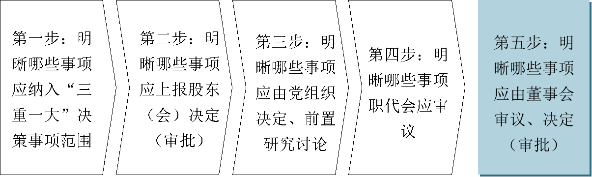 “三重一大”決策事項(xiàng),是股東會(huì)、董事會(huì)、黨組織等公司治理主體決策的核心事項(xiàng)。筆者所在求是咨詢團(tuán)隊(duì),基于常年國(guó)企治理管控咨詢實(shí)踐認(rèn)為,國(guó)有企業(yè)健全法人治理結(jié)構(gòu)的權(quán)責(zé)關(guān)鍵就在于:要科學(xué)合理地制定涵蓋各治理主體的“三重一大”的決策事項(xiàng)清單及流程。為此,我們構(gòu)建了如下國(guó)企制定“三重一大”決策事項(xiàng)清單“五步法”路線圖。