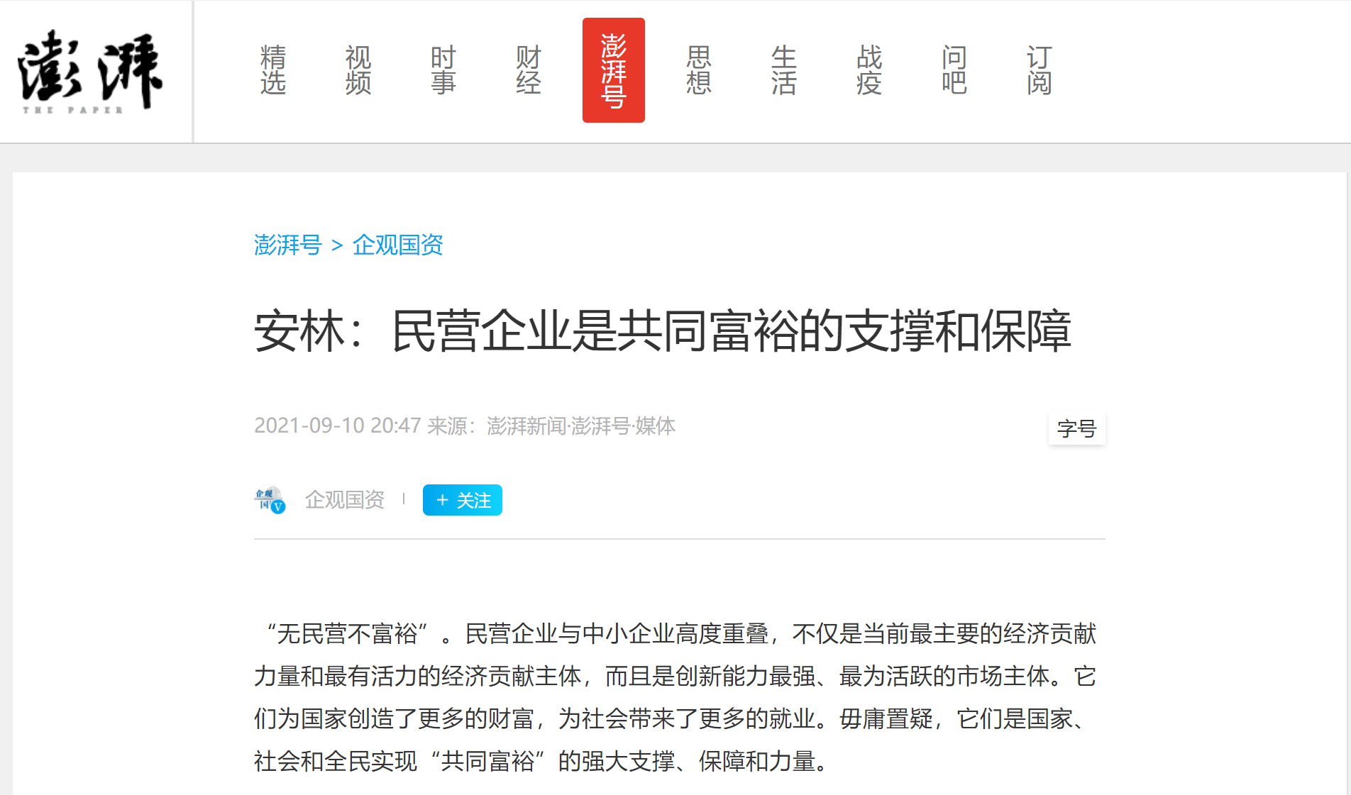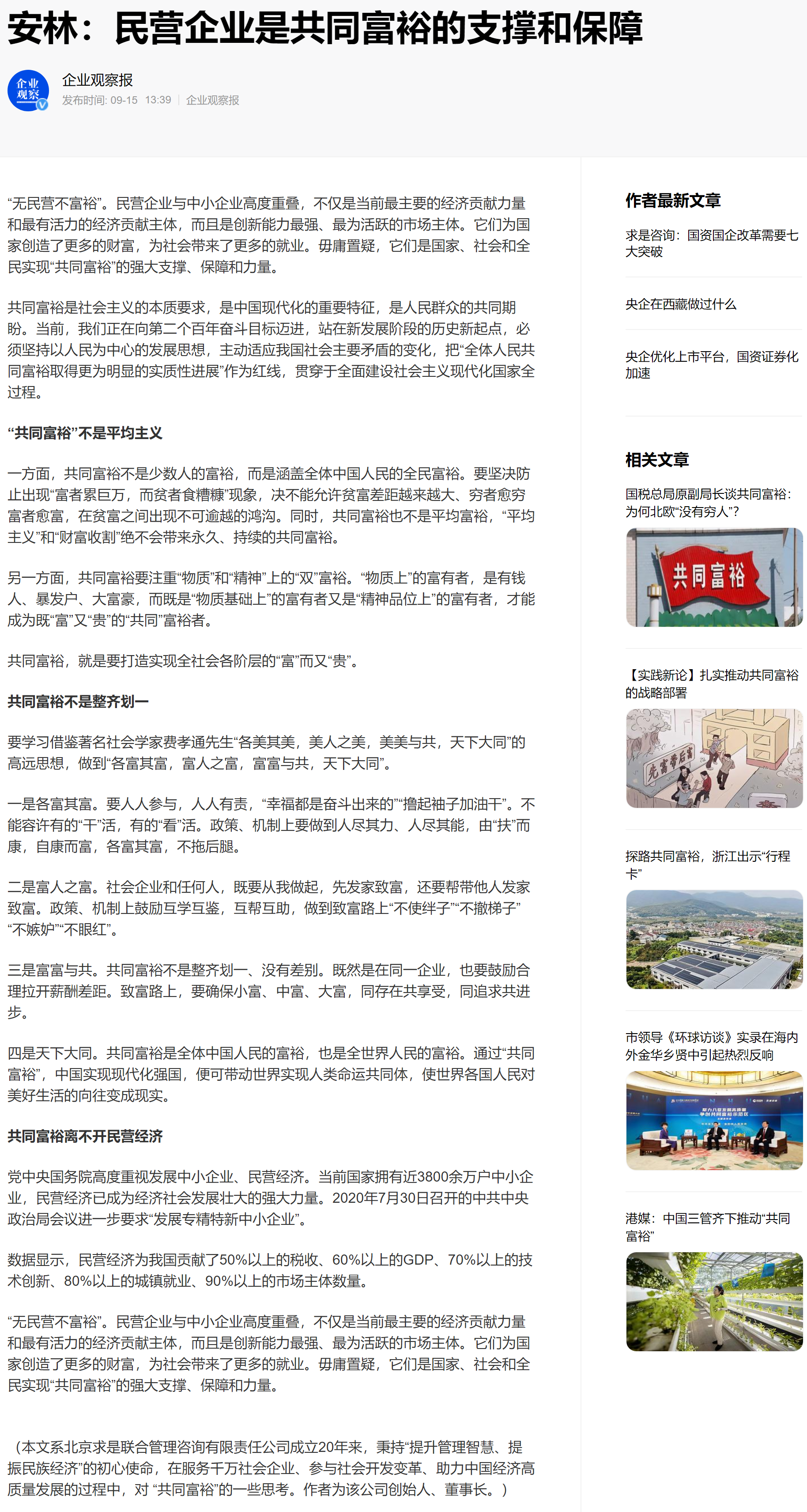 2021年9月10日,《企業(yè)觀察報(bào)》官微“企觀國(guó)資”發(fā)表求是咨詢董事長(zhǎng)安林博士的署名文章《安林:民營(yíng)企業(yè)是共同富裕的支撐和保障》。這也是北京求是聯(lián)合管理咨詢有限責(zé)任公司成立20年來(lái),秉持“提升管理智慧、提振民族經(jīng)濟(jì)”的初心使命,在服務(wù)千萬(wàn)社會(huì)企業(yè)、參與社會(huì)開發(fā)變革、助力中國(guó)經(jīng)濟(jì)高質(zhì)量發(fā)展的過(guò)程中,對(duì) “共同富裕”的一些思考。