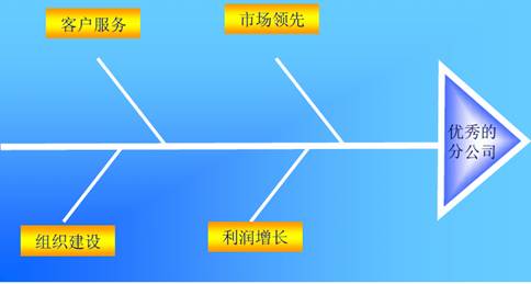 在選擇分公司KPI指標的時候,我們首先運用魚骨圖對于企業(yè)的關鍵成功要素進行了分析,關鍵成功要素是保證企業(yè)組織目標實現(xiàn)的重要保證,而這些關鍵成功要素也就是企業(yè)保持市場競爭力的關鍵環(huán)節(jié),必須予以格外的重視,也就是企業(yè)的關鍵績效領域。企業(yè)要想達成組織目標,必須把在這些關鍵領域保持較高的水平。