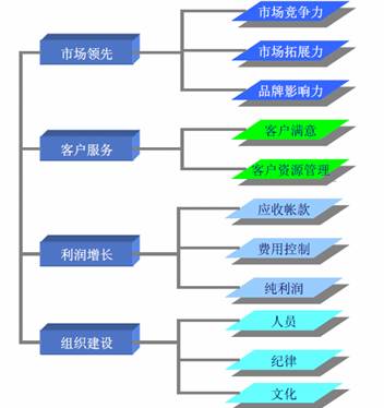 關鍵驅動因素分析,通常我們要進行兩個工作:1)進行關鍵驅動因素的敏感性分析,選擇對企業(yè)整體價值最有影響的幾個財務指標;2)就是將后置的財務價值驅動因素與前置的非財務價值驅動因素連接起來。一般情況下,我們是借用平衡記分卡的思想進行策略目標分解,來建立這種聯(lián)系。