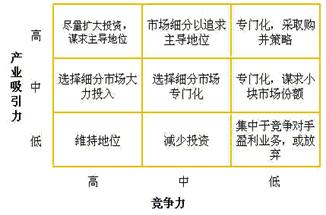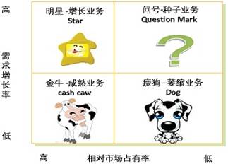 業(yè)務(wù)組合的傳統(tǒng)設(shè)計所依據(jù)的經(jīng)典理論,最為人們所熟悉的首先當屬波士頓矩陣。波士頓矩陣以縱軸的市場吸引力和橫軸的業(yè)務(wù)競爭能力來劃分出四個象限,用以得出企業(yè)所擁有的業(yè)務(wù)取舍的決策。其中,市場吸引力選用的指標是市場需求的增長速度,而業(yè)務(wù)競爭力的衡量指標是該業(yè)務(wù)所占有的市場份額大小。