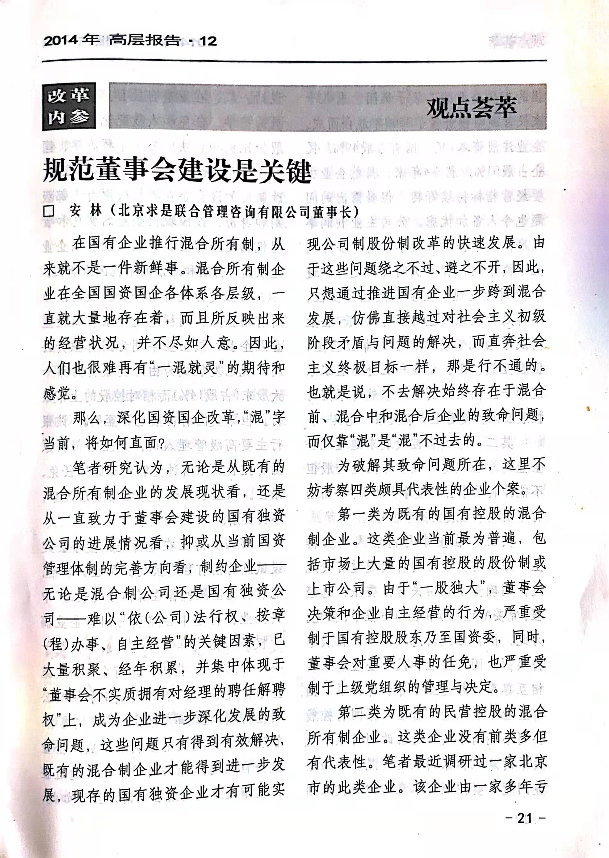 2014年6月,求是咨詢董事長(zhǎng)、《改革內(nèi)參》特約研究員安林博士,應(yīng)邀為《改革內(nèi)參》撰寫特約文章:《規(guī)范董事會(huì)建設(shè)是關(guān)鍵》。
