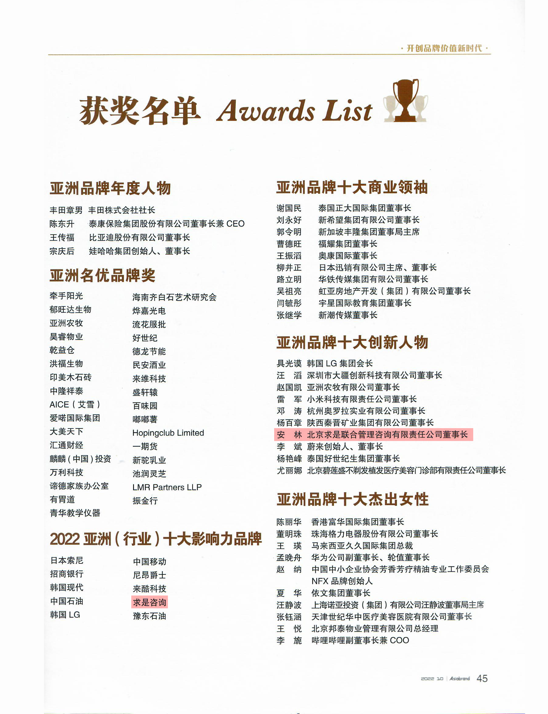 2022年10月27日,由專業(yè)品牌評價機構Asiabrand發(fā)起,并聯(lián)合中國亞洲經(jīng)濟發(fā)展協(xié)會、一帶一路總商會、東盟-中國工商總會、澳門商報、亞太第一衛(wèi)視聯(lián)合主辦的“亞洲品牌盛典”在??诼≈亻_幕。憑借卓越的品牌建設、突出的服務品質和雄厚的國資國企咨詢實力,求是咨詢及董事長安林博士分別榮膺“2022亞洲(行業(yè))十大影響力品牌”和“2022亞洲品牌十大創(chuàng)新人物”獎項。